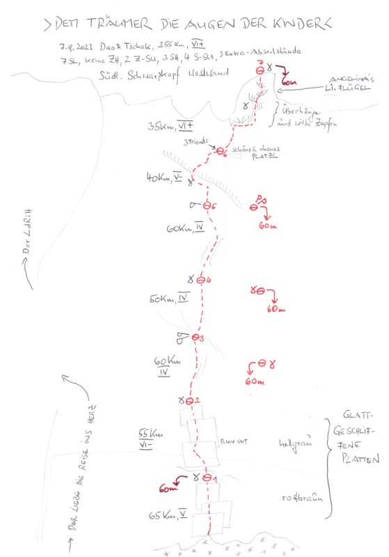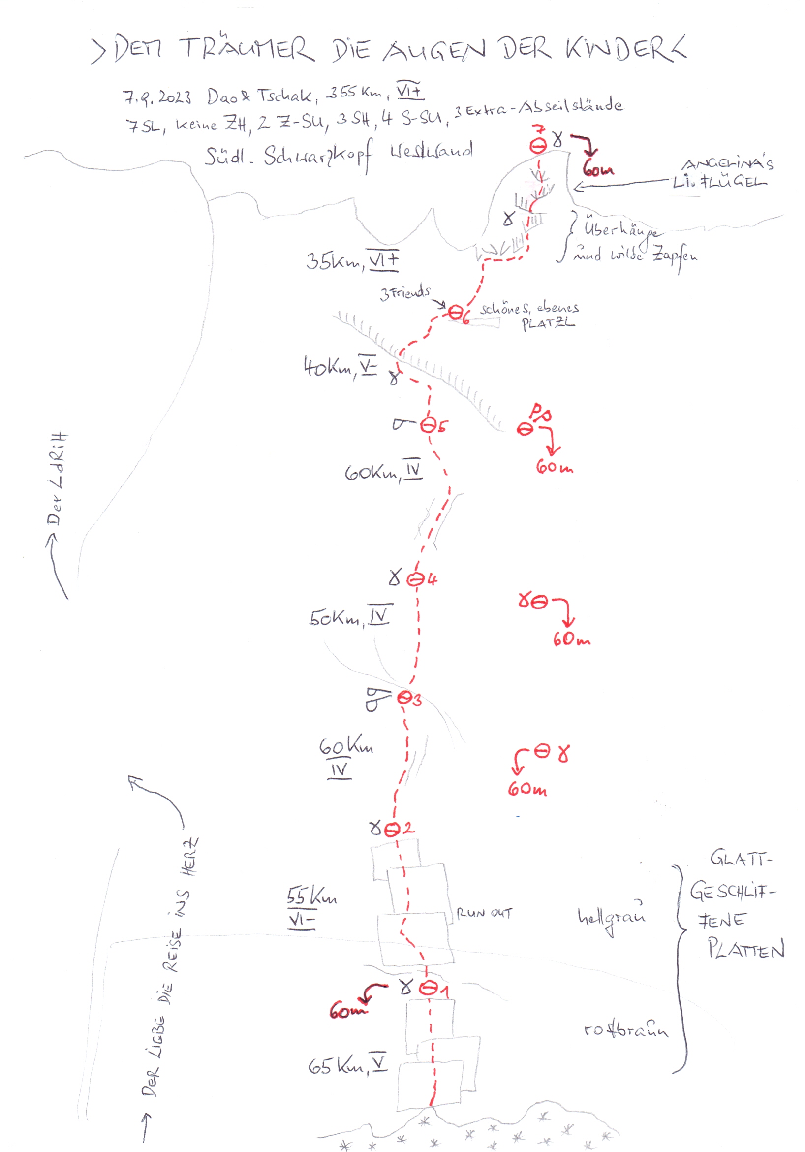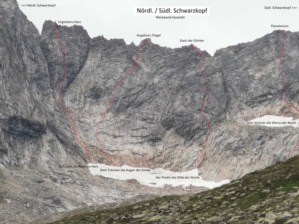 Ab dem Wandfuß durch die rostrot-geschliffenen Platten und dann gerade durch die graue Wand hinauf zu jener flügelförmigen Gratspitze, die sich rechts vom Urgesteinsherz vom Verbindungsgrat zwischen Nördlichem und Südlichen Schwarzkopf abhebt. Die steile, mit Überhängen gespickte, abdrängende Schlusswand auf die Flügelspitze wird direkt erklettert (Schlüsselseillänge).