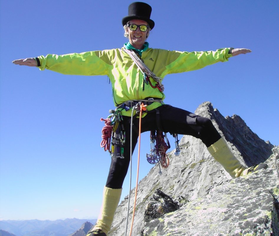 ---------------------------------------------------- * Beim Kunstprojekt „about a moment“ geht es um die drei Dimensionen ZEIT, RAUM, ICH. Und so wie sich Albert Einstein mit seinen „verborgenen Variablen“ fehlgreifend im Kreis dreht, so fügt sich hier stehgreifend ein: „Der Kreis, der sich schließt“. Ergänzend zu den drei Dimensionen ZEIT, RAUM, ICH. Als „Element der Realität“ sozusagen, quasi als unsichtbare Achse, - oder gar als "Nicht-Lokalität"? =|;) ------------------------------------------------------------------------------ * Zusätzlich wurde in das Kunstprojekt "about a moment" ein "Land-Art-Projekt" integriert, indem der Hierjetztspitze am 4.9.2022, im Zuge der Erstbegehung "Nie ist gleich immer", am Gipfel ein Stück Fels in orientalischer Spitzschuhform entnommen, zuhause mit Goldfarbe beschichtet und im darauffolgenden Jahr, am 19.8.2023, nunmehr vergoldet, im Zuge der Erstbegehung "Ichfrei ist gleich Freiheit", an Ort und Stelle wieder eingefügt wurde (zwar scheint dieser vergoldete „Schuh des Kalifen“ [siehe Bild] inzwischen mit irgendeiner Seilschaft wieder mit zurück ins Tal geklettert, sprich verschwunden zu sein, - aber wer weiß, vielleicht hatscht er ja über Umwege irgendwann wieder heimwärts ins Mekka Zillertal). Im nächsten Jahr, am 31.7.2024, wurde jedenfalls im Zuge der Erstbegehung „Nirgends ist gleich überall“ ein mannshoher Gipfelzacken vergoldet, der sich wohl NICHT mehr so schnell in Luft auflösen wird =|;) Seither leuchtet die Hierjetztspitze bei Sonnenschein magisch strahlend ringsum ins Hochgebirge: THE CROWN!