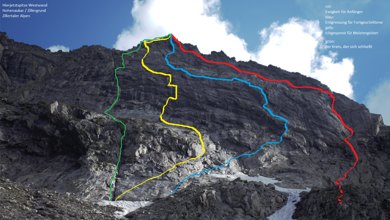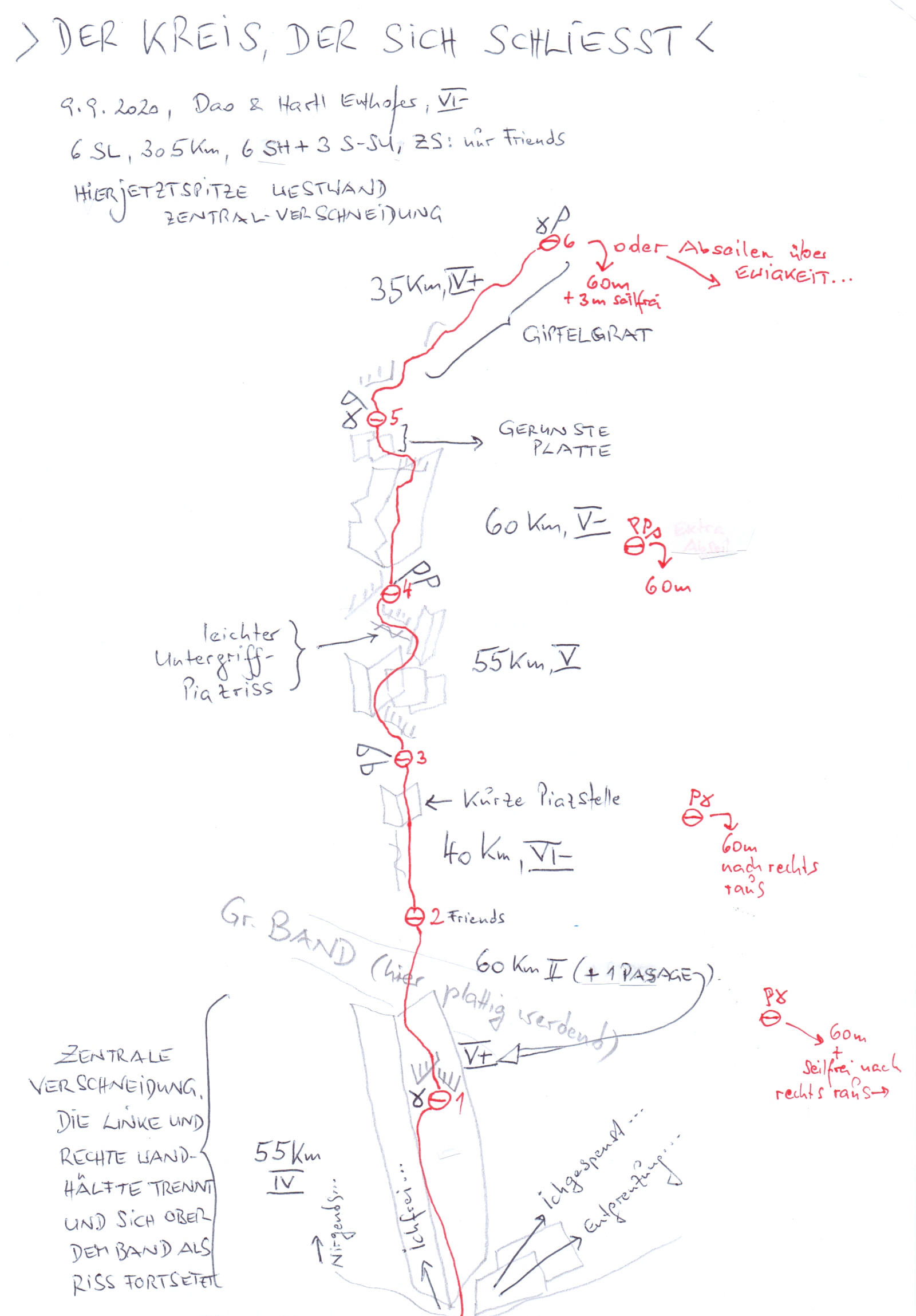 Im rechten Wandteil verlaufen 3 Routen, im linken wird es bald ebenso sein. In der Mitte, beginnend mit der zentralen Verschneidung und oben logisch weiterführend, verläuft "Der Kreis, der sich schließt".