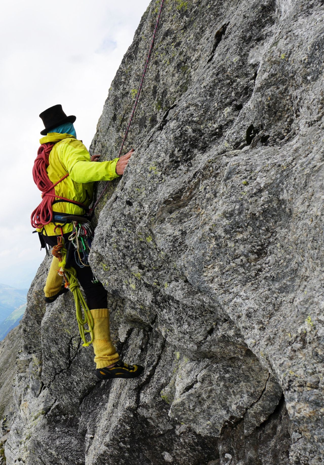 Nette, hochalpine Granitkletterei an nicht allzu steilen, flüssig kletterbaren Platten mit kaum vorhandener Zwischensicherung, die aber mit Friends gut selbst bewerkstelligt werden kann. Falls der Kletterhunger danach noch nicht gestillt ist, kann ja noch eine Nachbar-Route angehängt werden. Aber Achtung: inklusive Zu- und Abstieg ist der Tag auch mit einer einzelnen Hierjetztspitzen-Route in der Regel gut gefüllt!