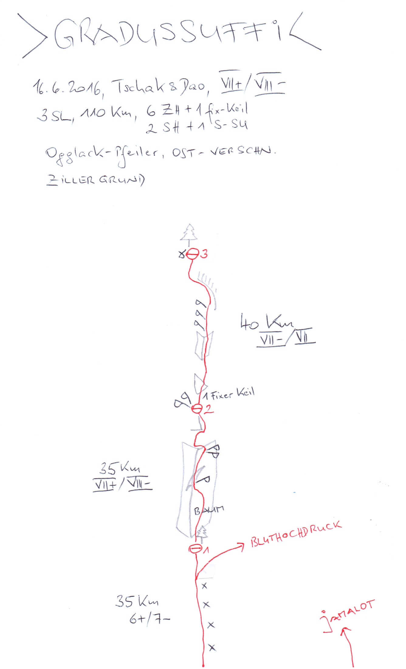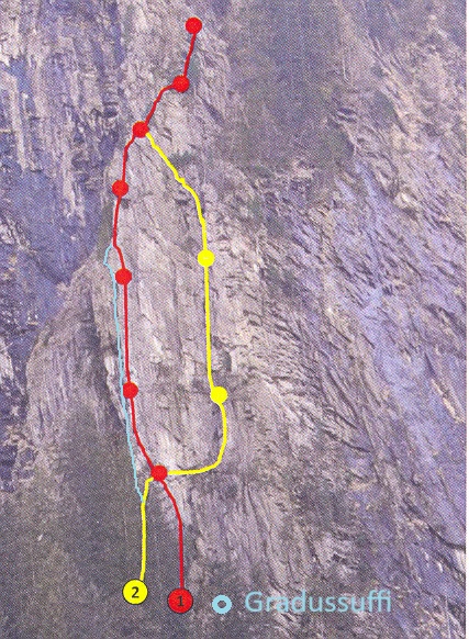 Wo die eingebohrte Route "Bluthochdruck" ab der 1. SL nach rechts quert, geht die "Gradussuffi", wie der gelernte Vorarlberger sagen würde, gradussuffi, also "gerade aus hinauf".