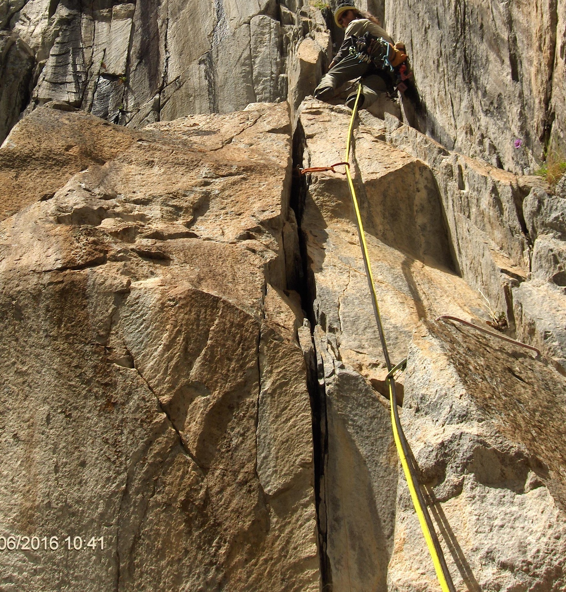 Die Erstbegeher schlugen zur Standsicherung 2 NH (belassen). Zur Zwischensicherung schlugen sie 6 NH, fixierten einen Stopper (alles belassen) und legten dort und da einen Friend. (Die Route "Bluthochdruck", über die man einsteigt, ist eingebohrt, sodass die erste SL mit Bolts ausgestattet ist.)