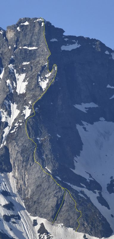 Der Floitenkamm, der sich vom Dristner bis zum Gr. Löffler erstreckt, hat viele Gipfel und Türme. Der zweite nach dem Dristner bzw. der Ligedlscharte und vor dem Blaser ist die Dhyana-Spitze, die von zwei Ostpfeilern geprägt wird. Über den rechten verläuft der Hermi-Pfeiler, immer direkt an der Kante bleibend, siehe Topo + die rechteste rote Linie auf dem Übersichtsfoto (= Wandbild mit Routen-Linien > beim Topo ganz nach rechts scrollen!).