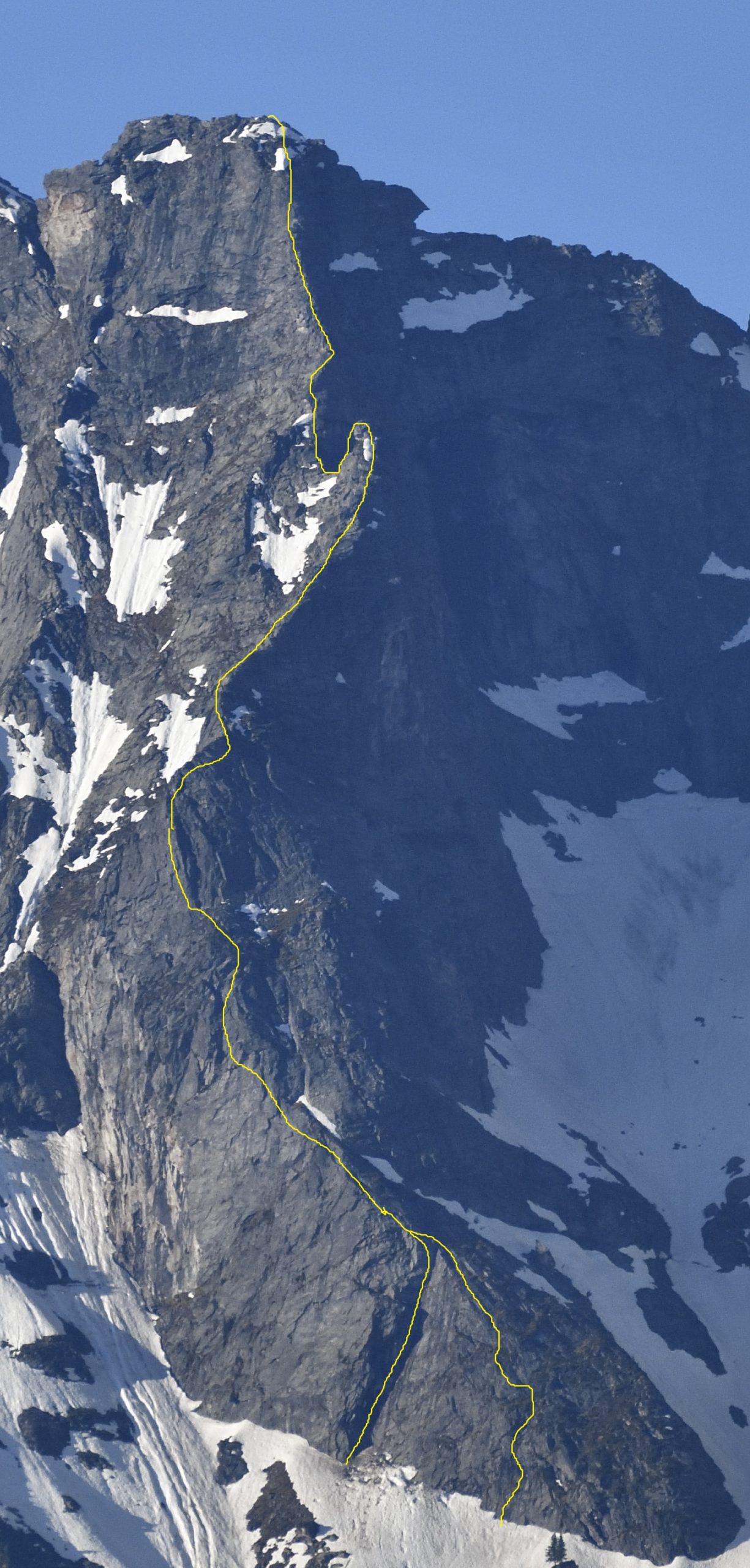 Bei der Erstbegehung wurde ledigliich 5 x ein Keil und 5 x ein Friend gelegt (1 Friend Gr. 1 belassen). Sonst Sicherungszacken (SZ)