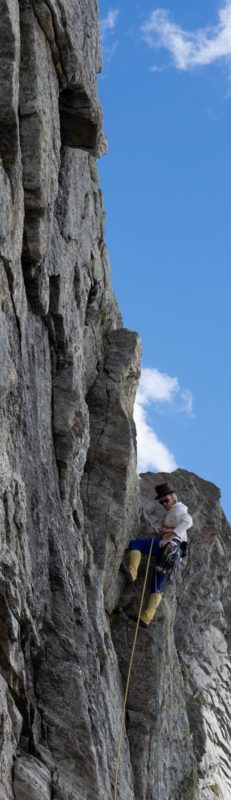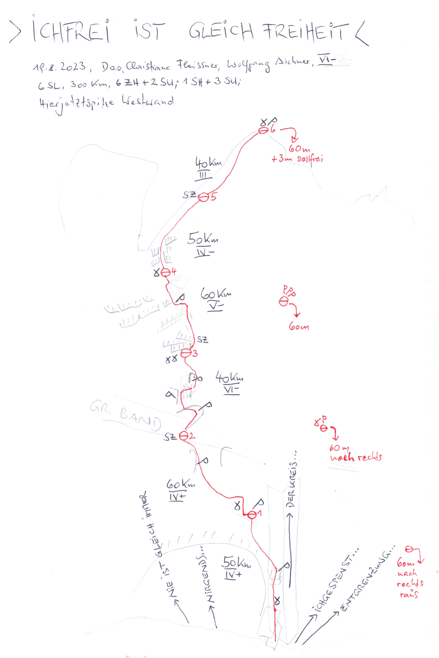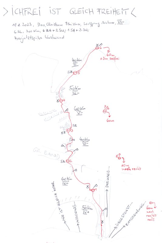 Kletterzeit der Erstbegeher: 4 Std. (samt Fotozeiten usw. f. d. Kunstprojekt)