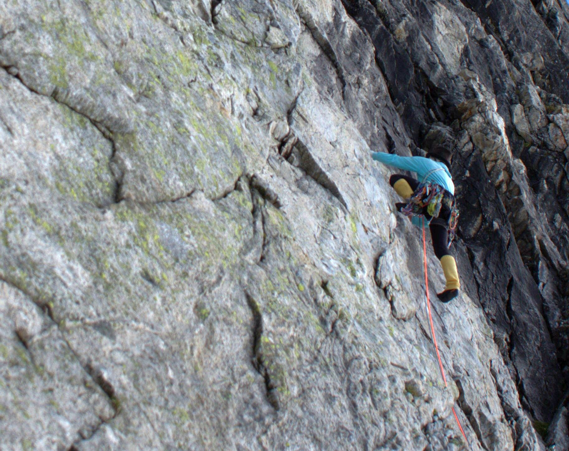 Schöne, hochalpine Granitkletterei an nicht allzu steilen, flüssig kletterbaren Platten mit wenig vorhandener Zwischensicherung, die aber mit Friends gut selbst bewerkstelligt werden kann. Falls der Kletterhunger danach noch nicht gestillt ist, kann ja noch eine Nachbar-Route angehängt werden. Aber Achtung: inklusive Zu- und Abstieg ist der Tag auch mit einer einzelnen Hierjetztspitzen-Route in der Regel gut gefüllt!