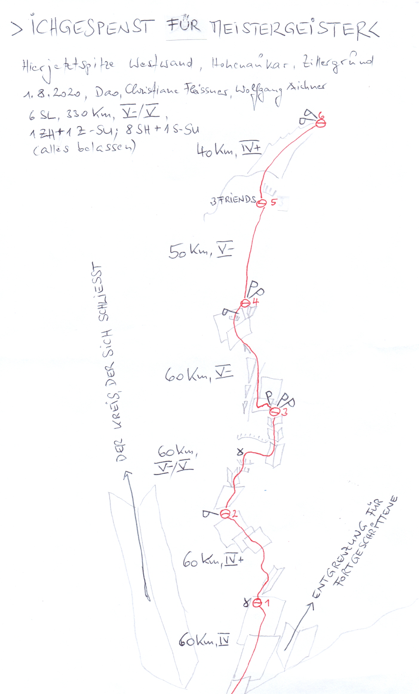 Links der am rechten Rand der Westwand befindlichen, markant-geschwungenen Verschneidung präsentieren sich die Platten und Verschneidungen im unteren Wandteil einerseits bedrohlich schwarz, andererseits in anmutend schöner, einladender Geometrie, die leichte, knifflig-anregende Kletterei verspricht. Und hält. Mitten durch sie hindurch verläuft die Route "Entgrenzung für Fortgeschrittene", links davon die gegenständliche Route "Ichgespenst für Meistergeister", - aber noch immer rechts der Zentral-Verschneidung, knapp rechts derer sie zwar einsteigt und in den auslaufenden Platten einen Rechtsbogen beschreibt der die flacheren Platten am rechten Rand des Bandes erreicht, oberhalb dessen aber direkt in der Platten-Geometrie des oberen Wandteils bis zum höchsten Punkt fortfährt.