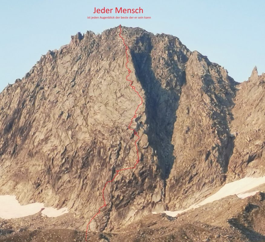 Bevor der untere, steile Wandteil oben in die geneigten Granitplatten knickt, ist er gespickt mit Dächern, Überhängen und exponiert herausragenden, mühlrad-artigen Felsscheiben. Der von Darshano postulierte und seit Jahren von ihm immer wieder ins Spiel gebrachte Aphorismus, den er hier auf den Routennamen übertragen hat, ist nicht nur im Hinblick auf den Gipfelnamen, nämlich die Richterspitze, provokant, sondern – zu Ende gedacht – auch sonst zu vielen weitreichenden Fragen des Lebens: gibt es tatsächlich einen freien Willen? Gibt es Schuld im moralischen Sinne? Könnte der Mensch bei gutem Willen anders, besser handeln, als er es tut? Ist die vielzitierte Menschenwürde auch auf diese Fragen anzuwenden? Usw usf.