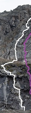 Man steigt im ganz linken Wandteil unter den markanten Überhang-Dächern ein und schwindelt sich in der 2. SL nach links über deren Ausläufer, indem man elegant die Dachkante entlang kletternd das Band gewinnt. Der obere Wandteil beginnt mit der ebenfalls ganz links beginnenden wunderschönen Granit-Verschneidung und bleibt in seiner logischen Weiterführung, bis die Wand nach oben im Rechtsbogen zum Gipfel hin ausläuft.