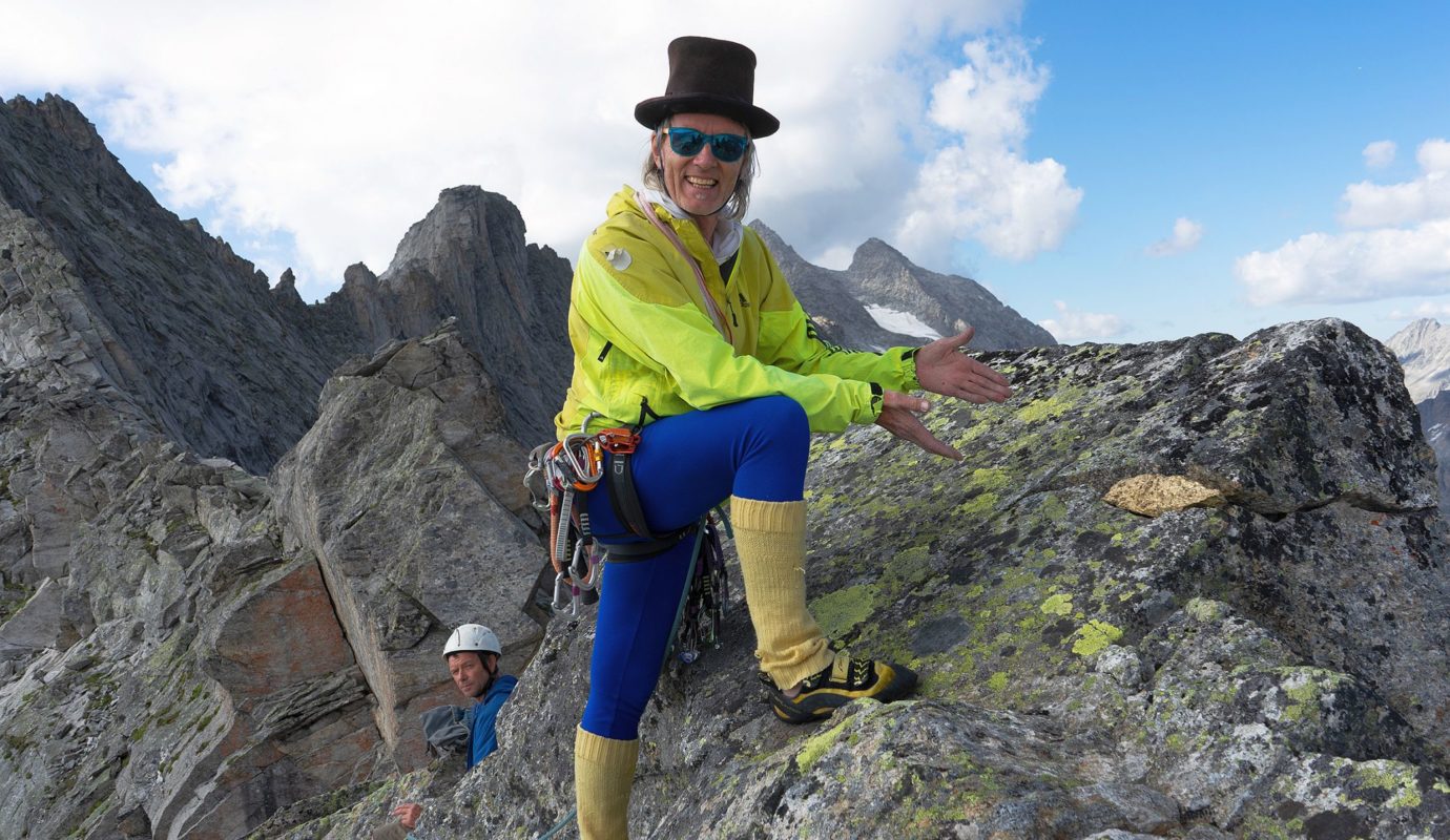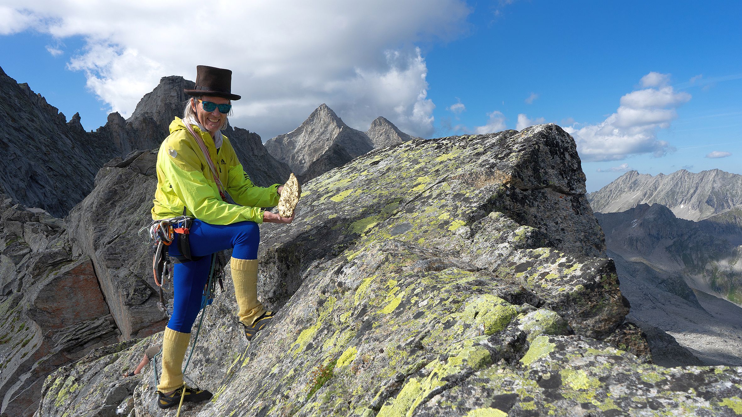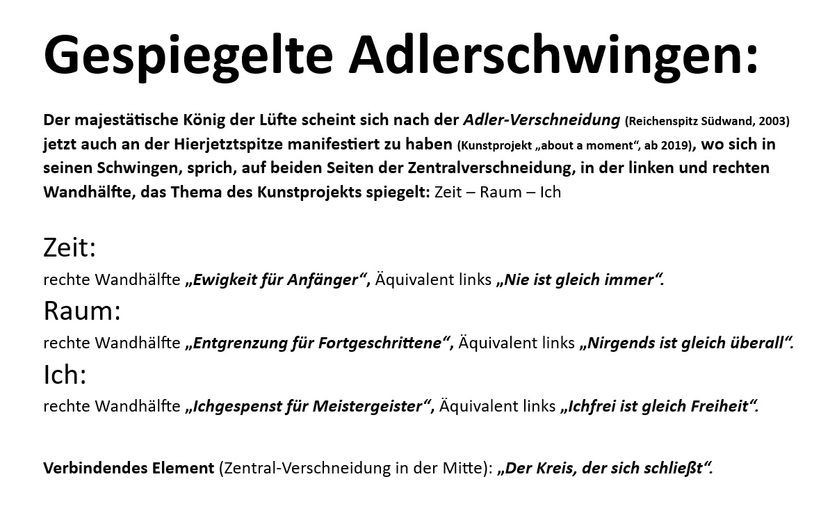 Am 4.9.2022 wurde der Hierjetztspitze im Zuge der Erstbegehung "Nie ist gleich immer" am Gipfel ein Stück Fels (in orientalischer Spitzschuhform) entnommen und zuhause mit Goldfarbe beschichtet. Um die Witterungsbeständigkeit der aufgebrachten Goldschicht zu überprüfen, wurde das Felsstück an der Wetterstation der Zugspitze auf knapp 3.000 m Meereshöhe dem hochalpinen Winter ausgesetzt (siehe Bild) und im darauffolgenden Jahr, am 19.8.2023, nunmehr vergoldet, im Zuge der Erstbegehung "Ichfrei ist gleich Freiheit", am Gipfel der Hierjetztspitze wieder in die ursprüngliche Fuge eingepasst (siehe Bild). Zwar scheint dieser „vergoldete Schuh des Kalifen“ inzwischen von irgendeiner kunstverliebten Seilschaft (oder Solo-Kletter’in) wieder zurück ins Tal gebracht worden zu sein (sprich: er ist verschwunden), - aber wer weiß, vielleicht hatscht er ja über Umwege irgendwann wieder heimwärts ins Zillertaler Mekka, oder in die „Welt der Kunst“ (siehe gelber Kasten rechts). Im nächsten Jahr, am 31.7.2024, wurde jedenfalls im Zuge der Erstbegehung „Nirgends ist gleich überall“ ein mannshoher Gipfelzacken vergoldet (siehe Bilder), der sich wohl nicht mehr so schnell in Luft auflösen wird =|;) Seither leuchtet die Hierjetztspitze bei Sonnenschein magisch strahlend ringsum ins Hochgebirge: THE CROWN!