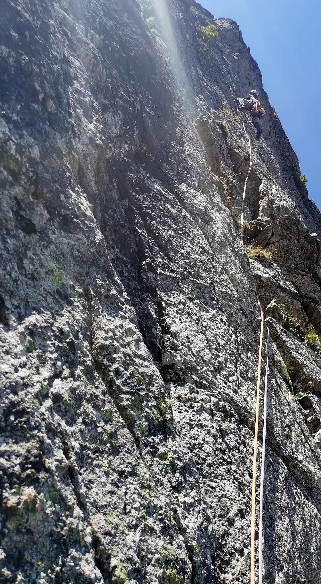 Die Erstbegeher fädelten zur Standsicherung eine SUen (belassen) und nutzten 2 Sicherungszacken. Zur Zwischensicherung schlugen sie 3 NH, fädelten 2 SUen (alles belassen) und legten dort und da einen Friend.