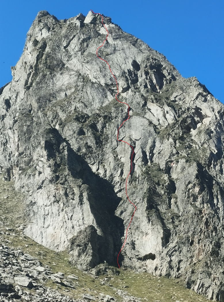In der Mauer, die im weitesten Sinne die rechte Begrenzungswand zur Haupt-Verschneidung bildet, zuerst gerade steil hinauf, dann nach links in die Gufel zu dem kleinen Bäumchen. An ihm rechts vorbei abdrängend zu einer Rampe, wo Stand bezogen wird (SU). Die darüber befindliche, nach oben hin immer mehr aufsteilende Schlusswand ist mit drei Zwischenhaken abgesichert und führt zu einem Pfeilerkopf (Stand), von welchem man in einer leichten Rechts-Links-Schleife zum Ausstieg klettert.