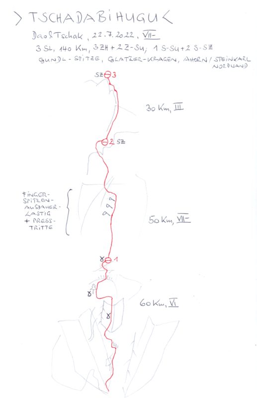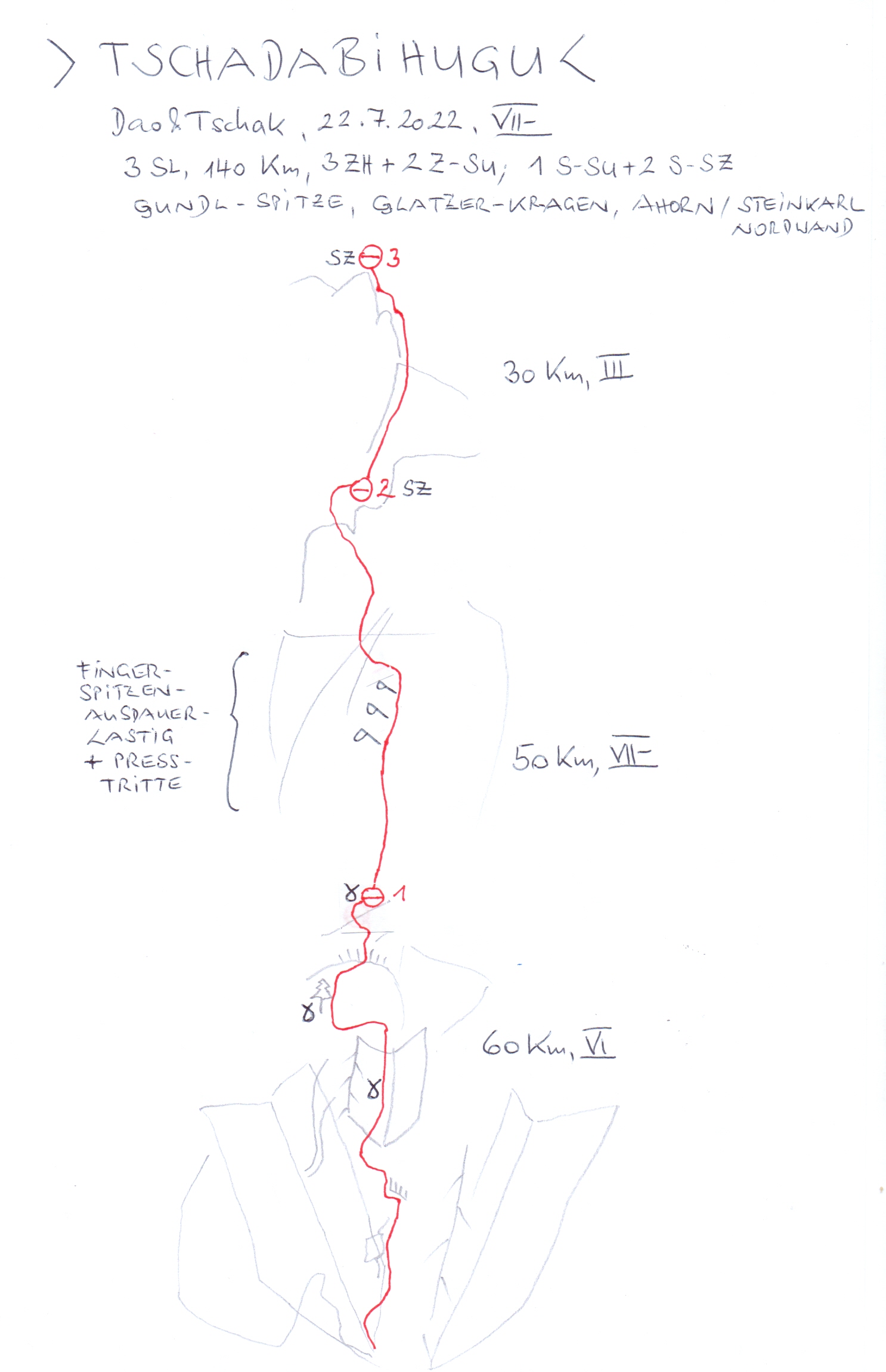 Vom Ausstieg etwa 70 m Richtung Süden zur Scharte zwischen Hubi-Spitze und Gundl-Spitze und in dieser Scharte leicht abkletternd (II) zurück zum Wandfuß.